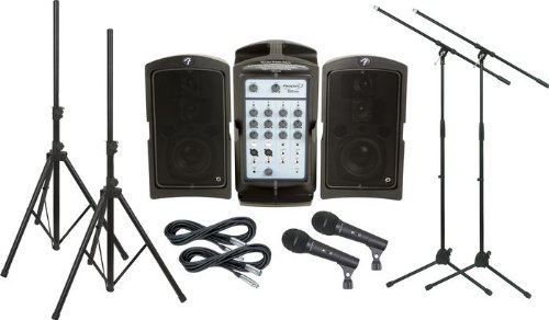 Fender Passport 150, Includes the Fender Passport 150 PRO portable PA system; 2 Audio-Technica M4000S hand-held dynamic mics; 2 MS-220 tripod mic stands with fixed boom; 2 XLR mic cables (20'); and 2 standard speaker stands.Fender Passport 150 PROThe 4-channel Fender Passport 150 PRO portable PA system is a full 3 pounds lighter than its predecessor, the Passport 150 system. Even so, it has an extra stereo channel (making it 2 total) and has improved speaker voicing. Other features include 150W output, 2 mic/line inputs, and tilt tone control on each channel, level, reverb send, master volume, master tone, and more.Take a close look and listen and the Fender Passport PRO 150 will take you places like never before. It is the sound that truly travels. For this generation of Passport PA systems Fender kept the best of previous versions and added improved functionality so that this Passport speaker system is ideal for whatever your application may beeducation and presentations, party gigs, small clubs, and coffee houses.Audio-Technica M4000S:The handheld Audio-Technica M4000S dynamic microphone combines professional features with a ridiculously affordable price tag. Audio-Technica tailors the M4000S mic's frequency response for crystal-clear vocal reproduction. Great feedback rejection and focused pickup are due to the A-T microphone's unidirectional polar pattern. The M4000S Audio-Technica mic also is equipped with a handy On/Off switch for convenience.Audio-Technica professional microphone enhancements include a balanced XLR output, and a mic clip. Whether you're on the road, in the studio, or just performing at local gigs. Expect the all-metal Audio-Technica M4000S microphone to provide you with years of trouble-free use.Musician's Gear MS-220 Tripod Mic Stand with Fixed BoomThe MS-220 Tripod Microphone Stand has a thread adapter and tubular legs. Its adjustable height from floor to top thread is 35" to 61-7/8". The 30-1/4" fixed boom is not adjustable.Musician's Gear Standard Speaker St